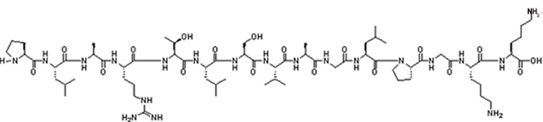 The native peptide PLARTLSVAGLPGKK is a selective substrate for CaM kinase II and PKC. It is also a poor substrate for phosphorylase kinase and is not phosphorylated by myosin light chain kinase. The sequence of PLARTLSVAGLPGKK is homologous to phosphorylation site 2 in glycogen synthase. The relative Vmax/Km ratios of the peptide for different kinases are 100 for CaMK II, 22 for PKC, 2 for phosphorylase kinase, and 0.5 for myosin light chain kinase, respectively.