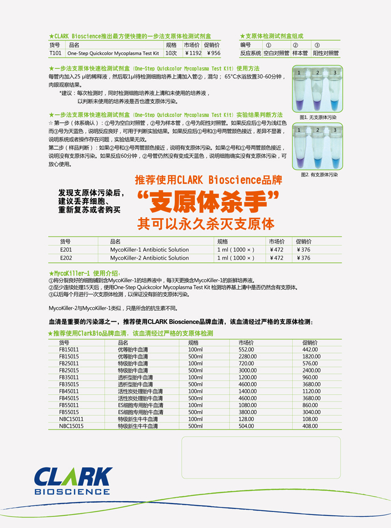 代理的试剂有:CLARK Bioscience 一步法支原体检测试剂盒、CLARK Bioscience 支原体杀手试剂盒、优等胚牛血清、特级胚牛血清等。凡在我司订购CLARK Bioscience品牌试剂盒的广大新老客户都可享受低于市场价10%的优惠,欢迎来电咨询。
